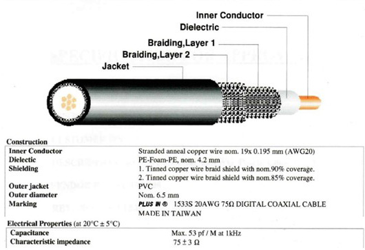 • 75Ω,RG-59,20AWG,SDI同軸電纜,特別適用於HD/3G-SDI訊號傳輸 75Ω, RG-59, 20AWG, SDI Coax, specifically designed for HD/3G-SDI signal transmission.