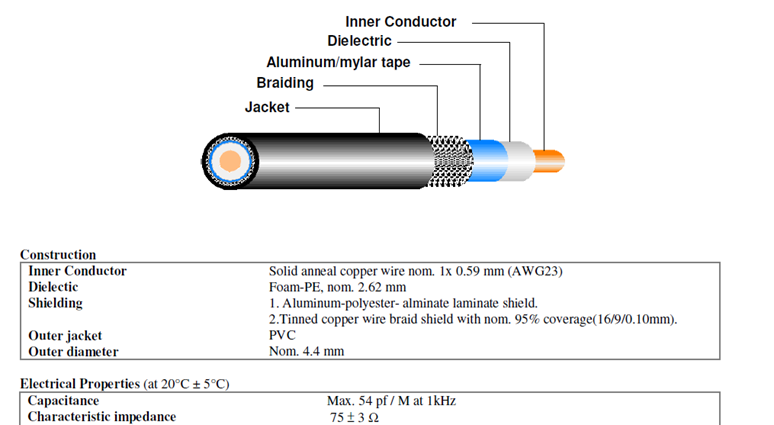 | 型號Model | 外被顏色Jacket Color | 中心導體結構Conductor | 絕緣材質Insulation | 遮蔽密度Shield | 特性阻抗Impedance(Ω) | 衰減Attenuation dB / 30M (1.5 GHz) |